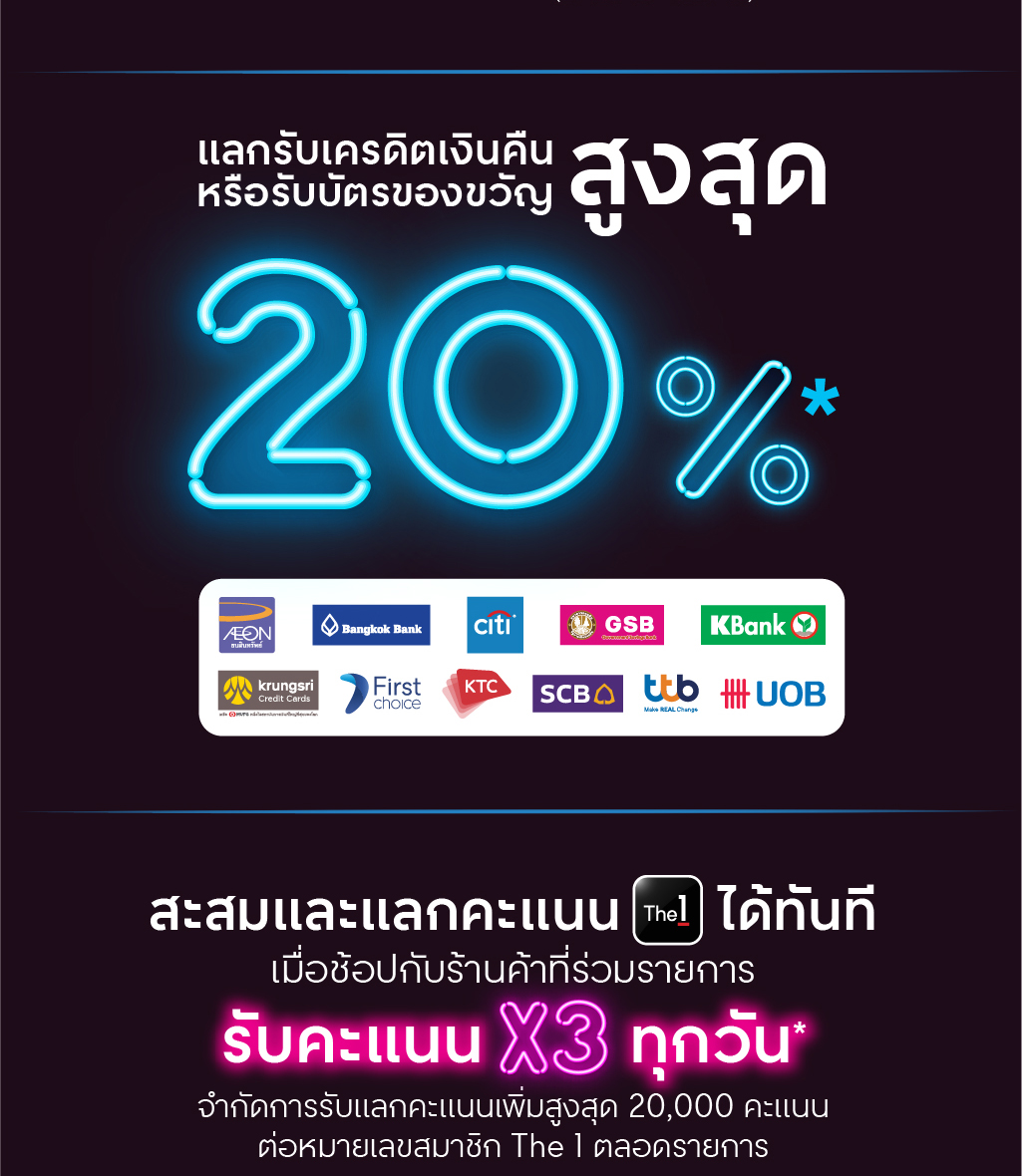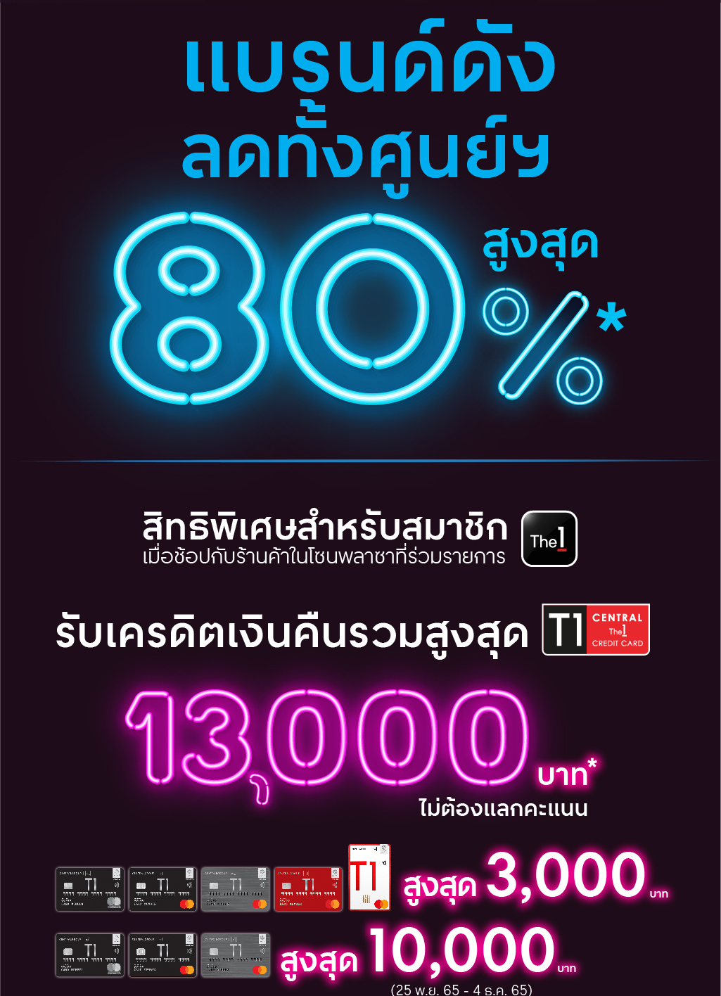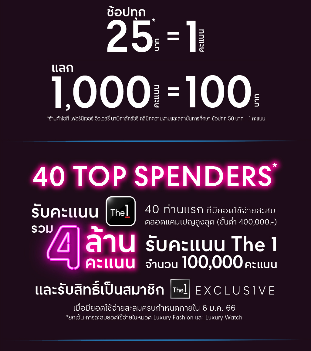 เงื่อนไขเป็นไปตามที่บริษัทฯ ห้าง ร้านค้า และธนาคารกำหนด • โปรดตรวจสอบเพิ่มเติม ณ จุดขาย/จุดแลกของสมนาคุณ • สงวนสิทธิ์ในการเปลี่ยนแปลงเงื่อนไข รางวัล และสิทธิประโยชน์ตามที่บริษัทฯ เห็นสมควรและเป็นไปตามที่กฏหมายกำหนด รวมถึงการผิดพลาดในการพิมพ์โดยไม่ต้องแจ้งให้ทราบล่วงหน้า • สงวนสิทธิ์ในการสะสมยอดใช้จ่าย และรับสิทธิพิเศษต่างๆ สำหรับเจ้าของสมาชิก The 1 ที่แสดงบัตรประชาชนและใช้บัตรเครดิตที่มีชื่อ-นามสกุลตรงกันเท่านั้น และนำใบเสร็จมาลงทะเบียน ณ จุดแลกของสมนาคุณ ตามเงื่อนไขที่บริษัทฯ กำหนด • ของรางวัลเป็นของรางวัลร่วมกับแคมเปญ EMBRACING HAPPINESS 2023 • ของรางวัล 40 Top Spenders ยกเว้น การสะสมยอดใช้จ่ายในหมวด Luxury Fashion และ Luxury Watch ได้แก่ ALEXANDER MCQUEEN, BALENCIAGA, BOTTEGA VENETA, CORTINA WATCH, ERMENEGILDO ZEGNA, GUCCI, HERMES, LOUIS VUITTON, PENDULUM, PMT THE HOUR GLASS, ROLEX, SAINT LAURENT, SALVATORE FERRAGAMO, SIAM SWISS, VERSACE และ OMEGA • คะแนนThe 1 จะเข้าอัตโนมัติภายใน 60 วันหลังจากสิ้นสุดรายการส่งเสริมการขาย • รับคะแนน The 1 พิเศษ X3 ทุกวันเมื่อใช้จ่าย ณ ร้านที่ร่วมรายการสะสมและแลกคะแนน The 1 และลงทะเบียน รับสิทธิ์ จำกัดการรับคะแนนสูงสุด 20,000 ต่อหมายเลขเดอะวันตลอดรายการ • บัตรเครดิตเซ็นทรัล เดอะวัน เดอะแบล็ค แบล็ค และลักซ์ รับเครดิตเงินคืนไม่ต้องแลกคะแนนสูงสุด 10,000 บาท ระหว่างวันที่ 25 พ.ย. 65 – 4 ธ.ค. 65 • แลกรับเครดิตเงินคืนสูงสุด 20% เมื่อใช้จ่ายผ่านบัตรเครดิตยูโอบี และบัตรเครดิตอิออนตามเงื่อนไขที่กำหนด • บัตรเครดิตยูโอบี รับสิทธิ์เฉพาะสาขาในกรุงเทพฯ และปริมณฑลเท่านั้น • บัตรเครดิตซิตี้ รับสิทธิ์เฉพาะสาขาในกรุงเทพฯ ปริมณฑลและเซ็นทรัล ภูเก็ตเท่านั้น, ผลิตภัณฑ์และ/หรือบริการนี้ ถูกนำเสนอโดยธนาคารยูโอบี จำกัด (มหาชน) และ/หรือ บริษัทในเครือที่เกี่ยวข้อง ซึ่งได้รับอนุญาตจากซิตี้กรุ๊ปให้ใช้เครื่องหมายทางการค้าเป็นการชั่วคราว โดยมีธนาคารซิตี้แบงก์ เอ็น.เอ. สาขากรุงเทพฯ เป็นผู้ให้บริการ • บัตรเครดิตกสิกรไทย ยกเว้นเซ็นทรัลวิลเลจ • สมาชิกบัตรในเครือกรุงศรี คอนซูเมอร์ ผ่อน 0% สูงสุด 24 เดือน (เฉพาะแผนก/ร้านค้า และสินค้าที่ร่วมรายการ) • โปรดตรวจสอบเพิ่มเติม ณ จุดแลกของสมนาคุณของศูนย์การค้าเซ็นทรัลสาขาที่ต้องการรับสิทธิ์