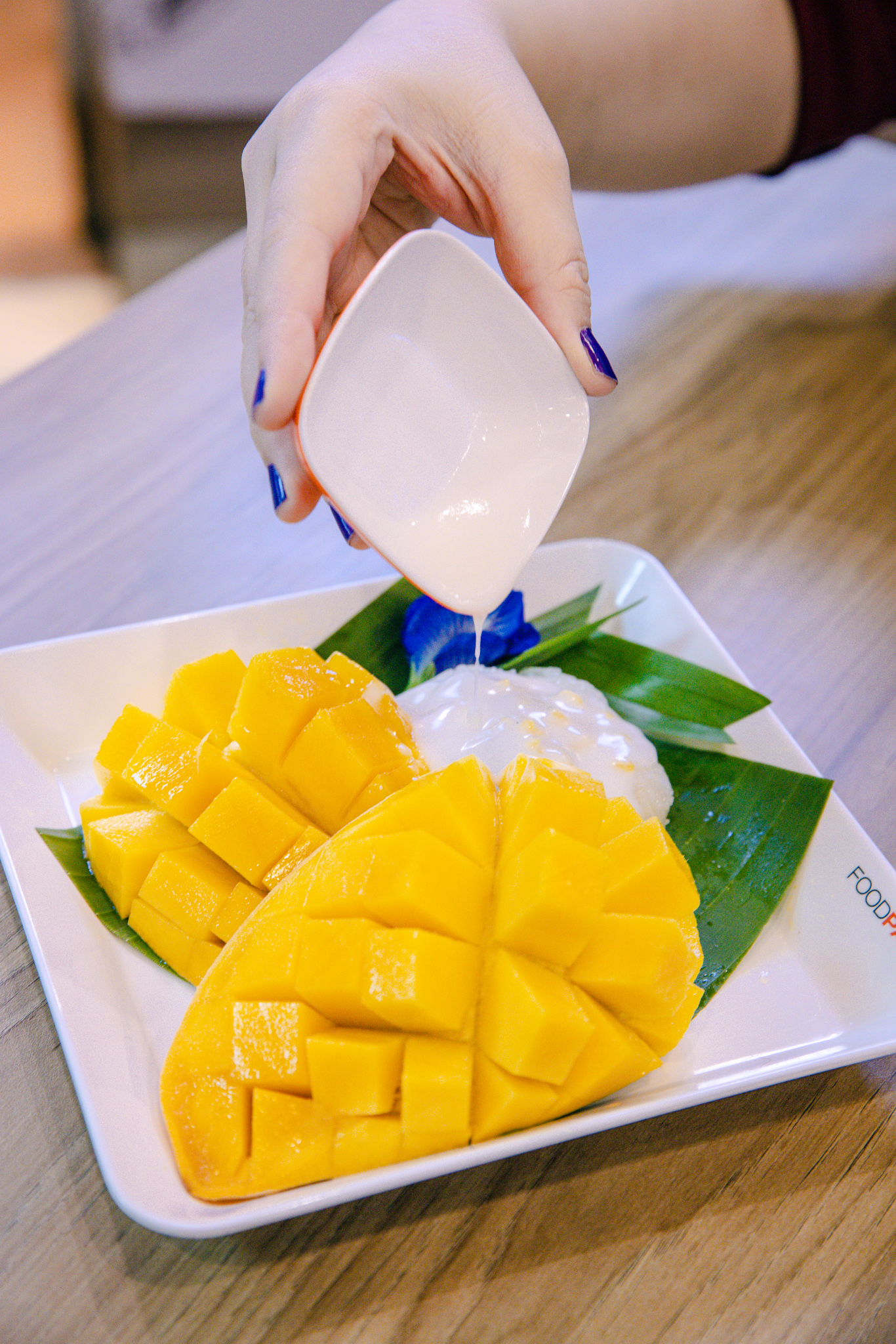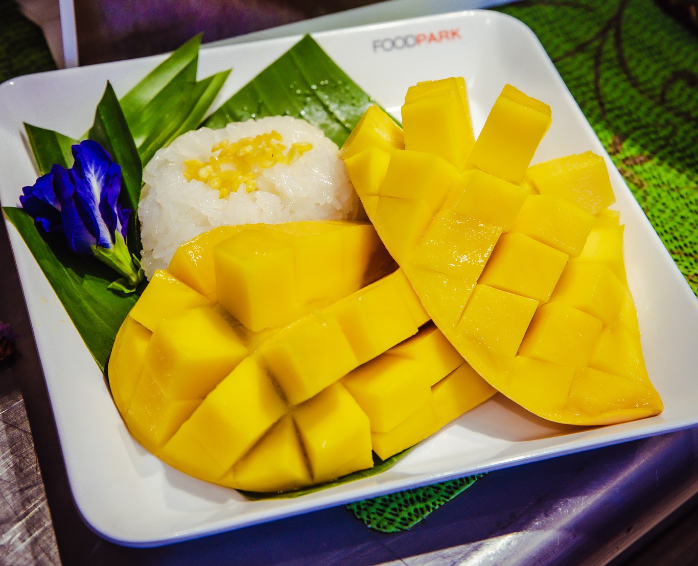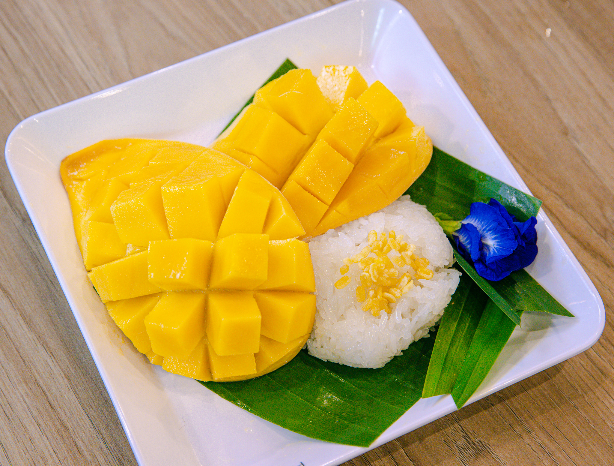 Mango sticky rice is a local Thai dessert. The ingredients can be found locally. Sticky rice that is made Mango Sticky Rice is Snake Fangs Sticky Rice. It has a sticky stickiness but not mushy, good smell, and a soft, delicious texture. When steamed with coconut milk, it is deliciously sweet and soft. For the mango, it is often used as Nam Dok Mai mango and Ok Rong mango. Because they have a beautiful golden yellow color, fresh, and sweet.